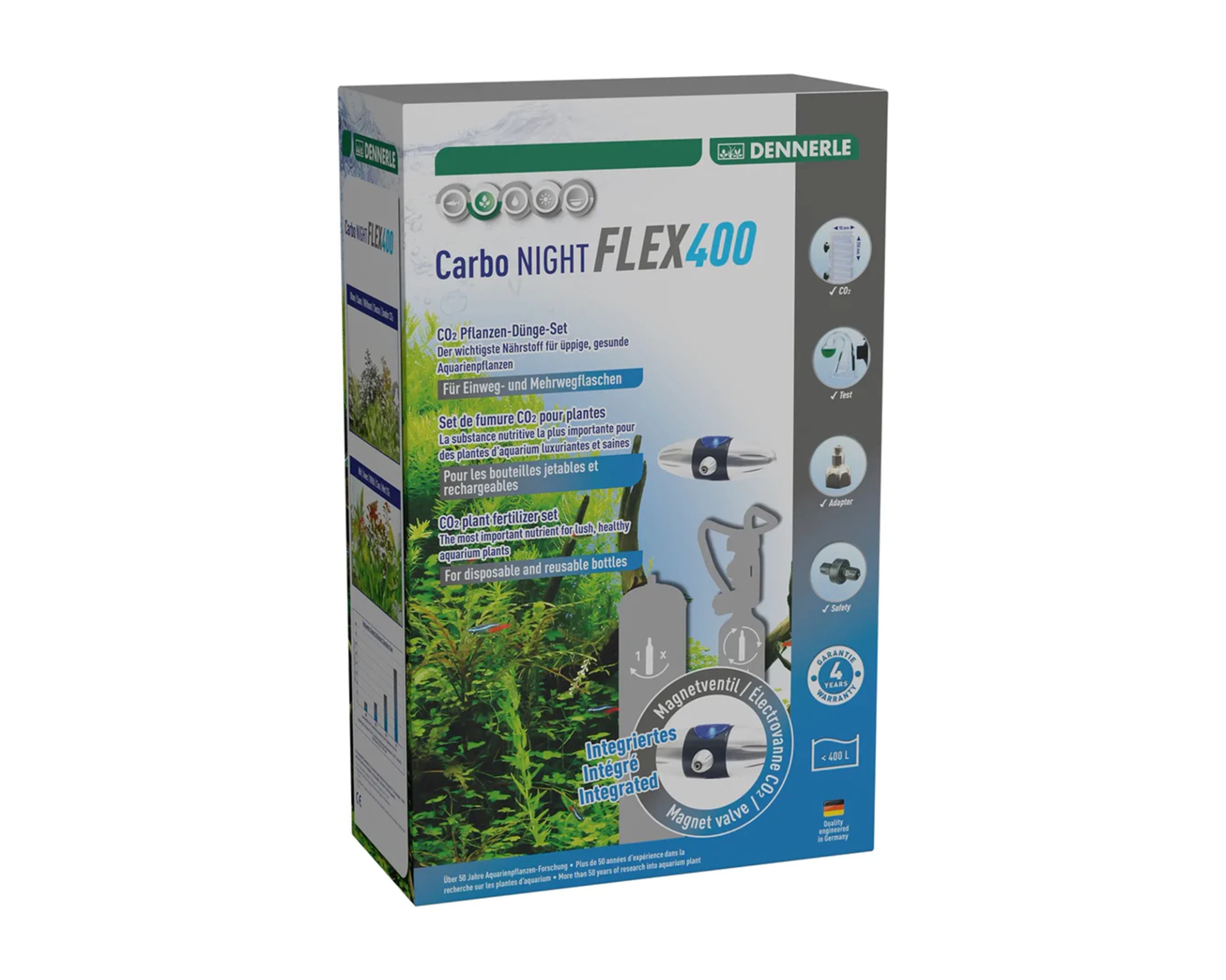 De Dennerle Carbo Night Flex400 is een compleet en flexibel CO₂-systeem, speciaal ontworpen voor gezonde en krachtige plantengroei in aquaria tot 400 liter. Dankzij het innovatieve Flex-systeem kunt u zowel wegwerp- als hervulbare CO₂-cilinders gebruiken (niet inbegrepen). De meegeleverde adapter maakt het eenvoudig om te wisselen tussen beide, zodat uw aquarium nooit zonder CO₂ komt te staan.