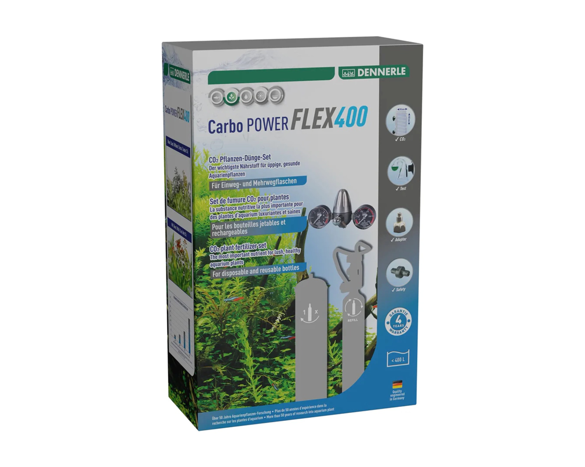De Dennerle Carbo Power Flex400 is een compleet CO₂-systeem ontworpen voor veeleisende aquaria tot 400 liter. Dankzij het innovatieve Flex-systeem biedt deze set maximale flexibiliteit: met de meegeleverde adapter kunt u zowel wegwerp- als hervulbare CO₂-flessen gebruiken (flessen niet inbegrepen). Zo blijft uw aquarium altijd voorzien van CO₂, zelfs wanneer uw hervulbare fles leeg raakt.