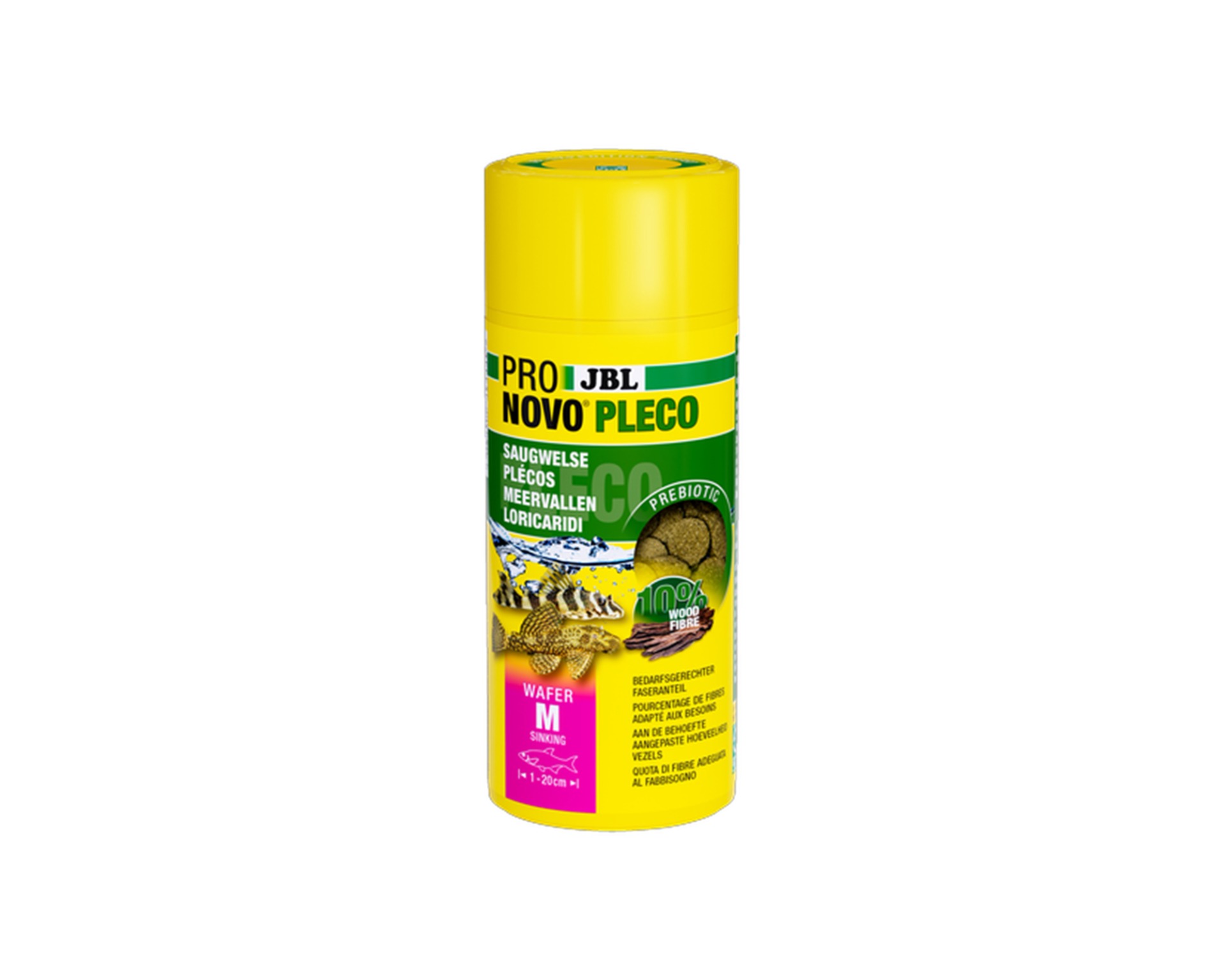 JBL ProNovo Pleco Wafer M zijn snelzinkende wafers voor herbivore zuigervissen (1–20 cm) zoals pleco’s. Ze bevatten natuurlijke ingrediënten (spinazie, spirulina, garnalen) en extra houtdeeltjes voor de knaagbehoefte van speciale soorten zoals antennebaarsjes.