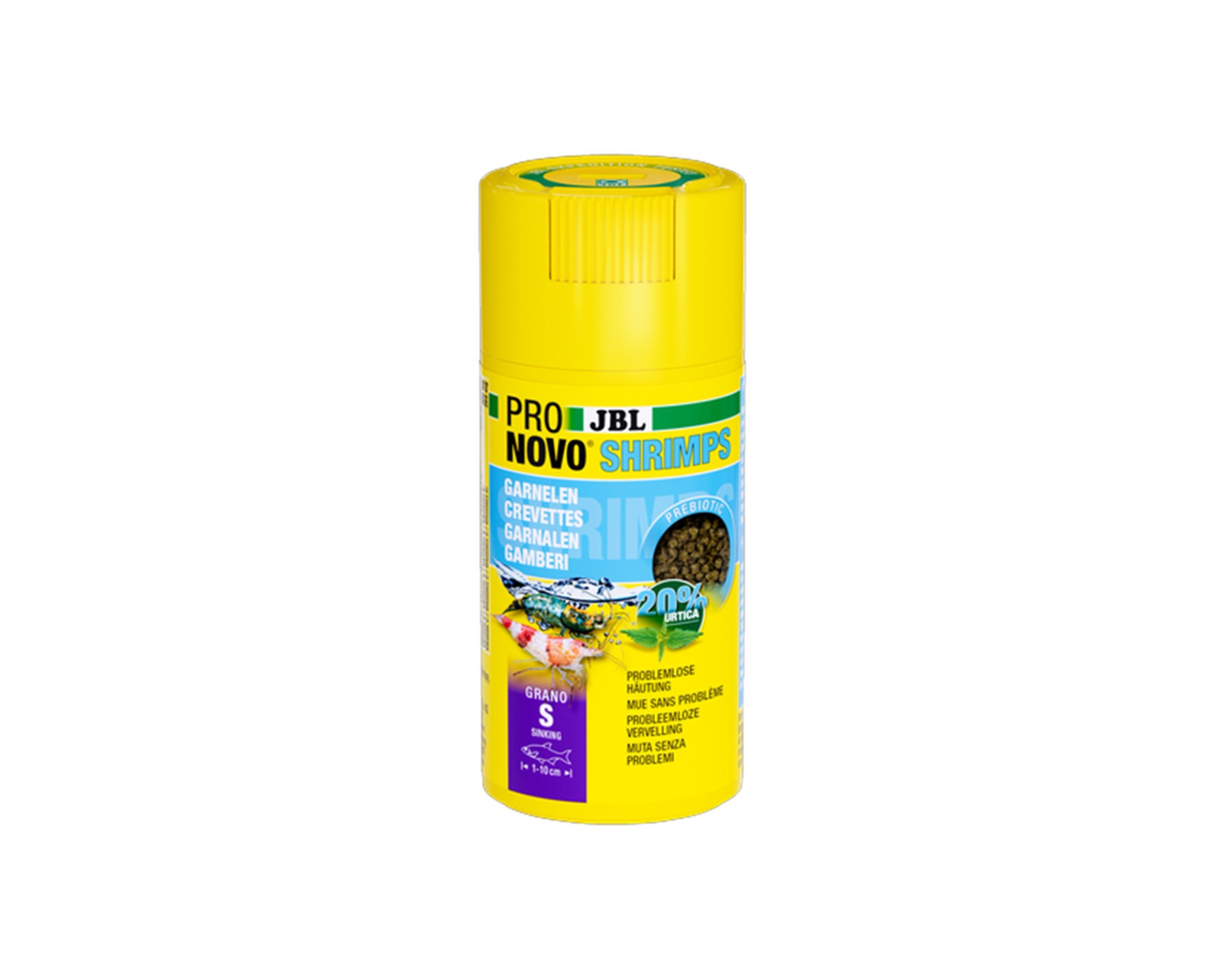 JBL ProNovo Shrimps Grano S is een gespecialiseerd hoofdfvoer voor aquatische garnalen (1–20 cm). Met een uitgebalanceerde samenstelling op basis van brandnetelmeel bevordert het een mooie kleuring en gezonde groei van de garnalen, en voorziet het dankzij extra vezels in een gezonde darmflora.